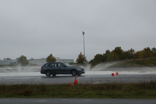 Beim Überfahren der hydraulischen Dynamikplatte bekommt das Auto einen seitlichen Kick, so dass es nach rechts oder links ausbricht und der Fahrer es ausgleichen muss. Dies kann z. B. bei einem geplatzten Reifen oder zu schnellem Spurwechsel passieren. Unsere Übung bestand darin, unsere Autos gekonnt abzufangen.