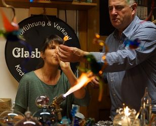 Die Flamme wurde größer, umschloss das Glas und ließ es langsam schmelzen. Die Glasröhre musste schnell zwischen den Händen hin- und hergedreht werden. Dann blieb das Glas so lange im Feuer bis es glühte. Wer eine farbige Kugel haben wollte, wälzte den glühenden Teil in kleinen farbigen Scherben, um ihn danach wieder ins Feuer zu halten, damit die Glasscherben mit dem glühenden Glas verschmolzen. Danach wurde in die Glasröhre gepustet. Anfangs ganz behutsam und zum Schluss mit aller Kraft. Der glühende Teil blähte sich wie ein Luftballon auf und eine Kugel entstand.