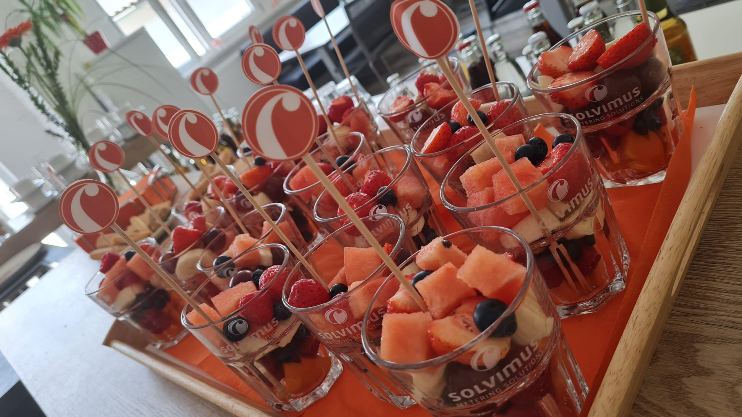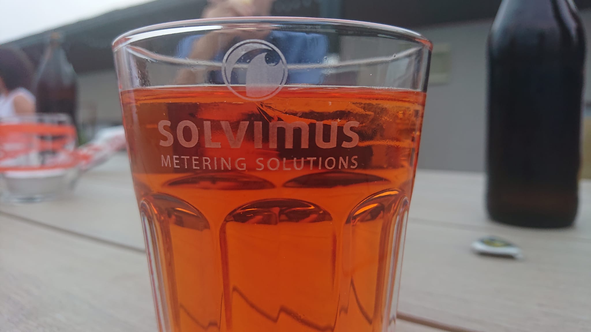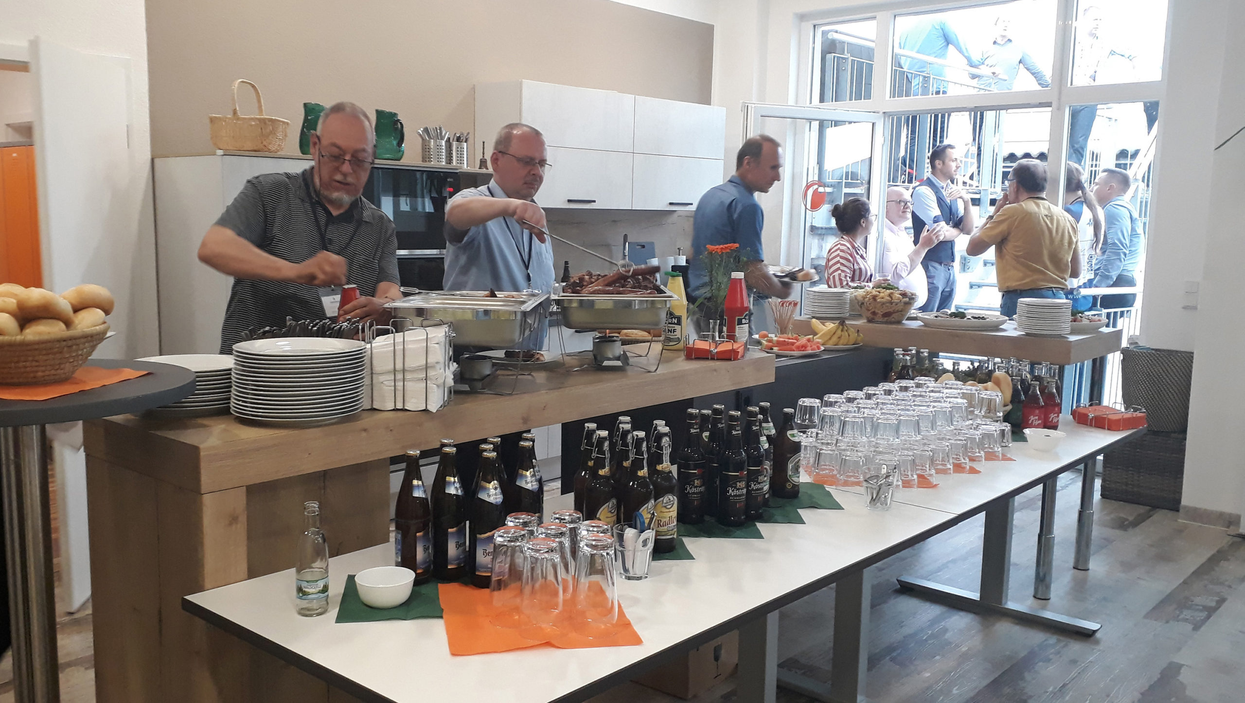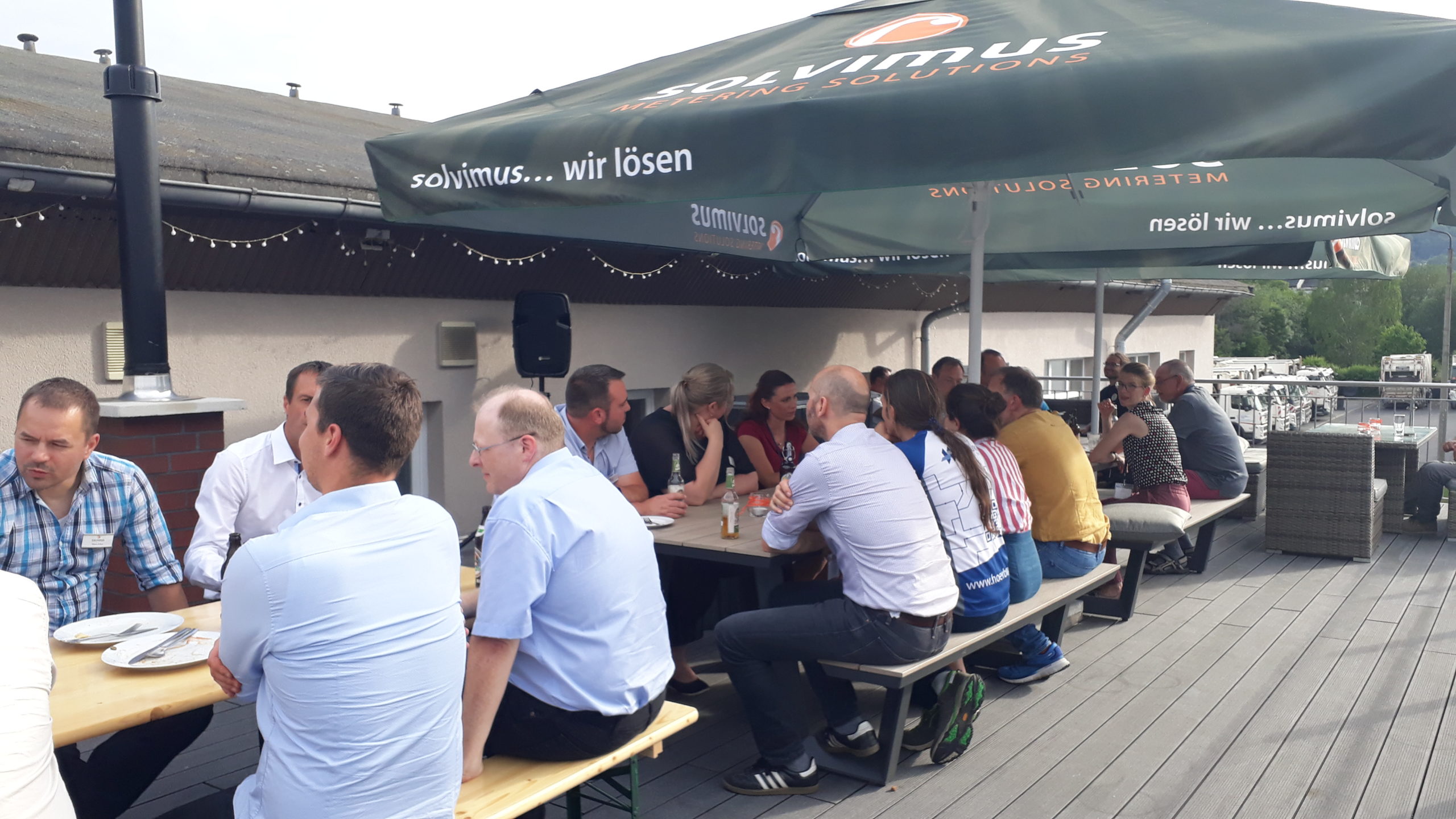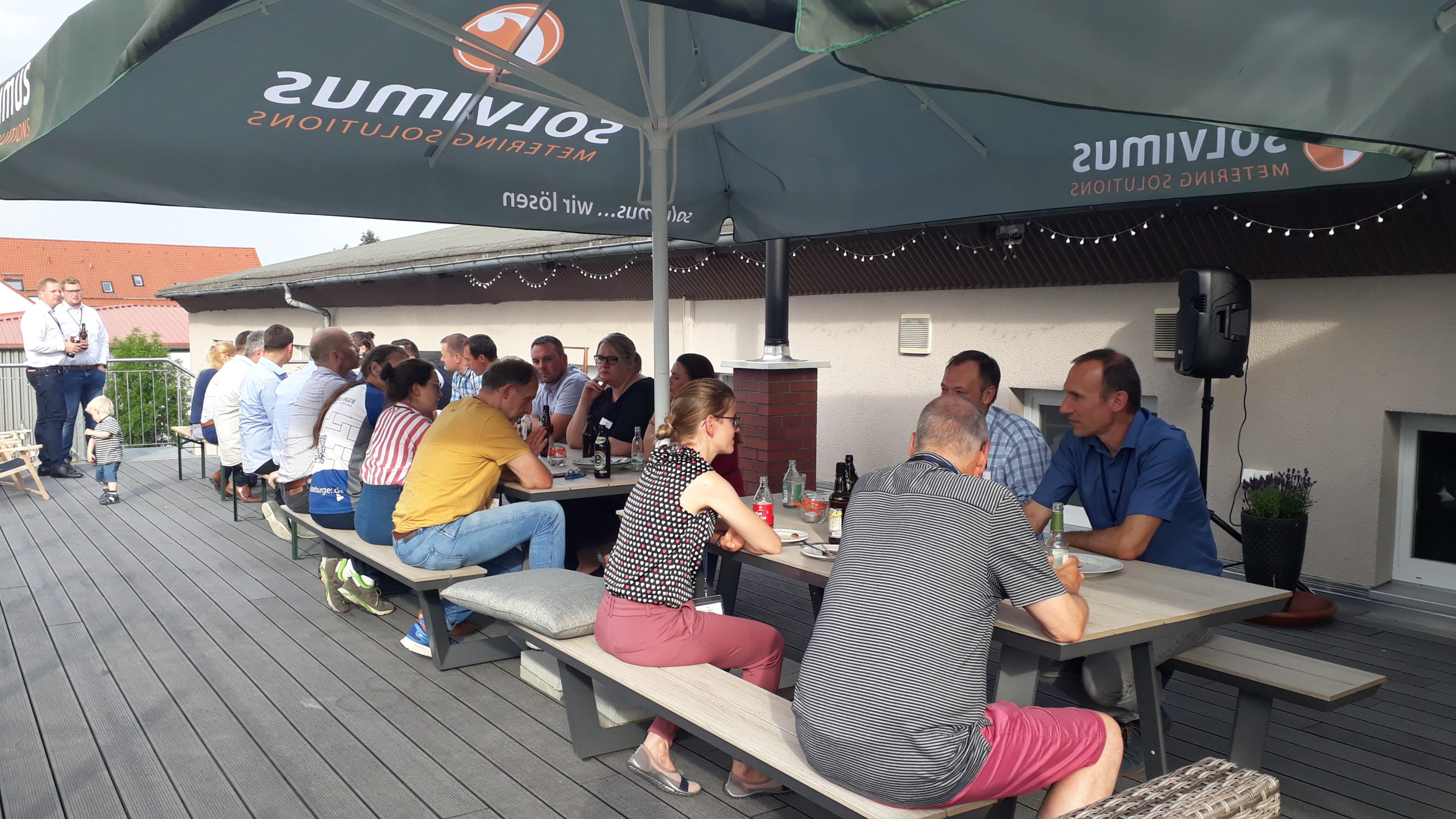 The eventful day faded out on our large outside terrace with an informal get-together and Thuringian barbecue specialities by GOURMET Partyservice. Our “Signature Drink” in solvimus-type orange and brand-labelled glasses added up to chilled beverages and beer.