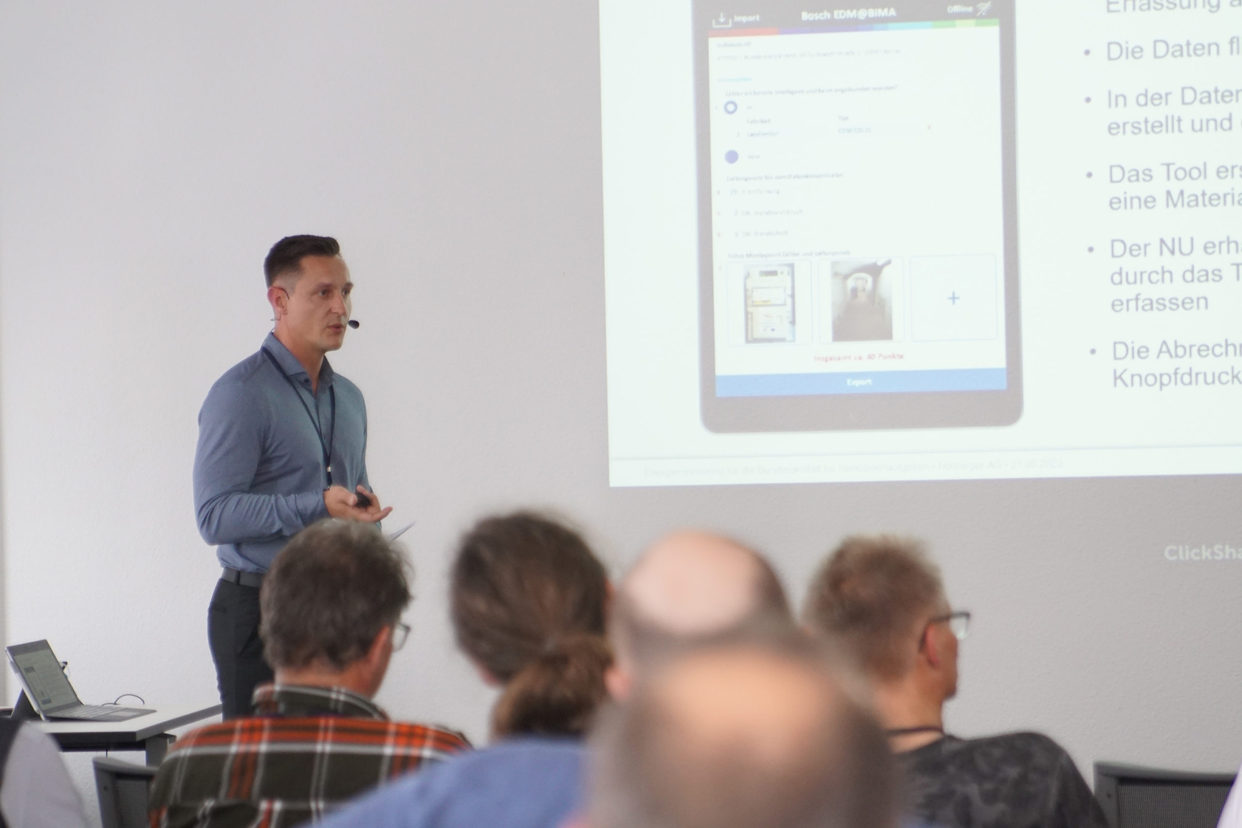 The first to present was Markus Müllenberg, Hörburger AG with his presentation entitled “Energy monitoring for the Institute for Federal Real Estate”. It was pointed out that the challenges in the installation of energy monitoring solutions in numerous and very diverse properties are not exclusively of technical nature. Also the investment in organization and logistics is considerable.